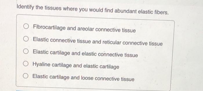 Compact bone and hyaline cartilage. Reticular fiber is also formed from the same protein subunits as collagen fibers. Identify the tissues where you would find abundant elastic fibers.